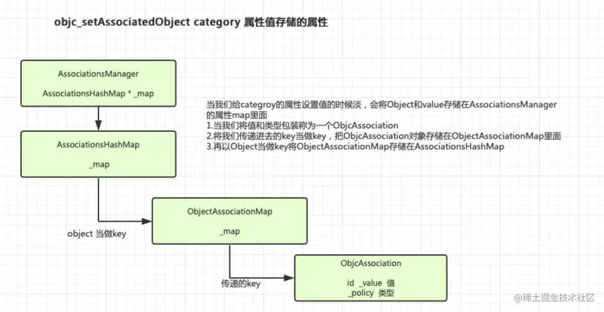 void _object_set_associative_reference(id object, void *key, id value, uintptr_t policy) { // 一下为精简的代码 id new_value = value ? acquireValue(value, policy) : nil; { AssociationsManager manager; AssociationsHashMap &associations(manager.associations()); disguised_ptr_t disguised_object = DISGUISE(object); if (new_value) { ObjectAssociationMap *refs = new ObjectAssociationMap; associations[disguised_object] = refs; (*refs)[key] = ObjcAssociation(policy, new_value); } } }