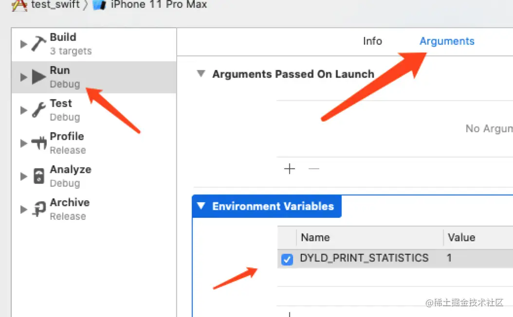 Edit scheme -> Run -> Arguments)DYLD_PRINT_STATISTICS设置为1,可以打印出来每个阶段的时间- 如果需要更详细的信息,那就设置