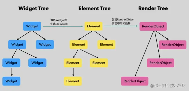 这个也算是老生常谈了,网上有很多关于这三个类(树)的介绍。实际上,可能在我们初学flutter时,就看过类似的文章介绍。