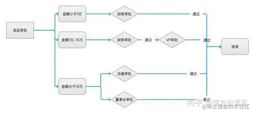 顾名思义,混合流程就是混合了以上几种流程,还是以上述金额审批为例,若金额低于1万元,由财务审批通过后即结束;金额在1万元到10万元的,需要先由财务审批,之后交由副总裁审批通过后即结束;金额高于10万元的,需要由董事长和总裁一同审批通过后才结束。