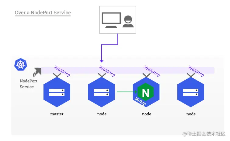 - 然后在每个节点上开辟nodePort的端口(该端口为宿主机的端口),