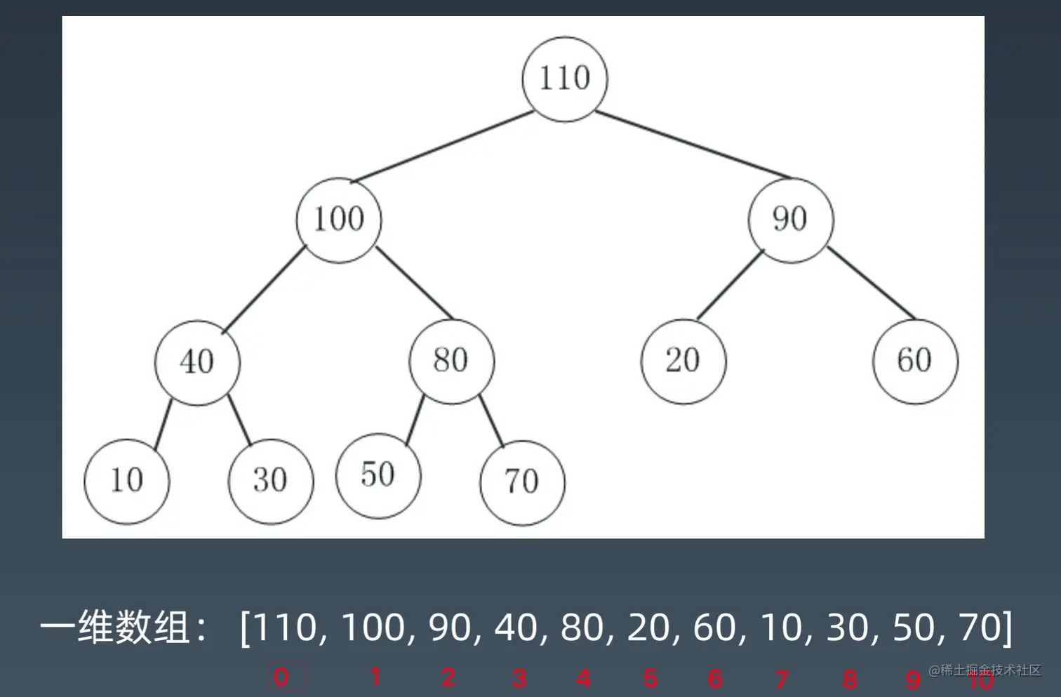 因为把一个完全二叉树依次放到一维数组里面去,那么它的孩子和父亲之间的关系,就可以直接用下班的数学关系表示了。