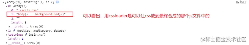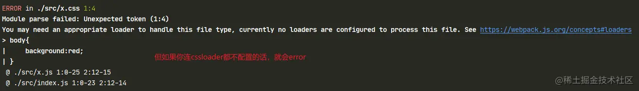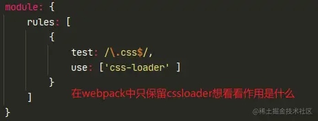 如果只用cssloader则你在js中引入的css是会被放到< head >下面的< style >中也就是内部样式