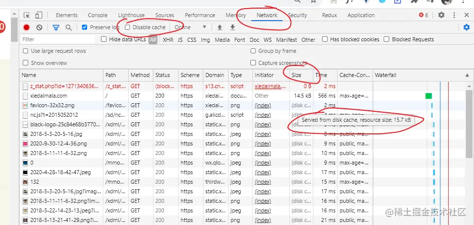 别勾选Disable cache才可以看到Size中设置了支持HTTP缓存的文件是缓存在硬盘中的而不是每次都去服务器拿