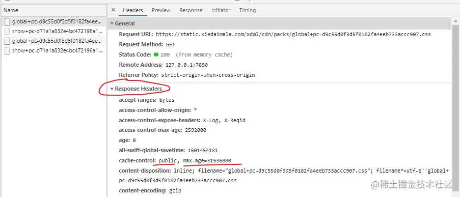 可以看到在响应头中http缓存为公开,任何人都可以缓存,最长时限是1年