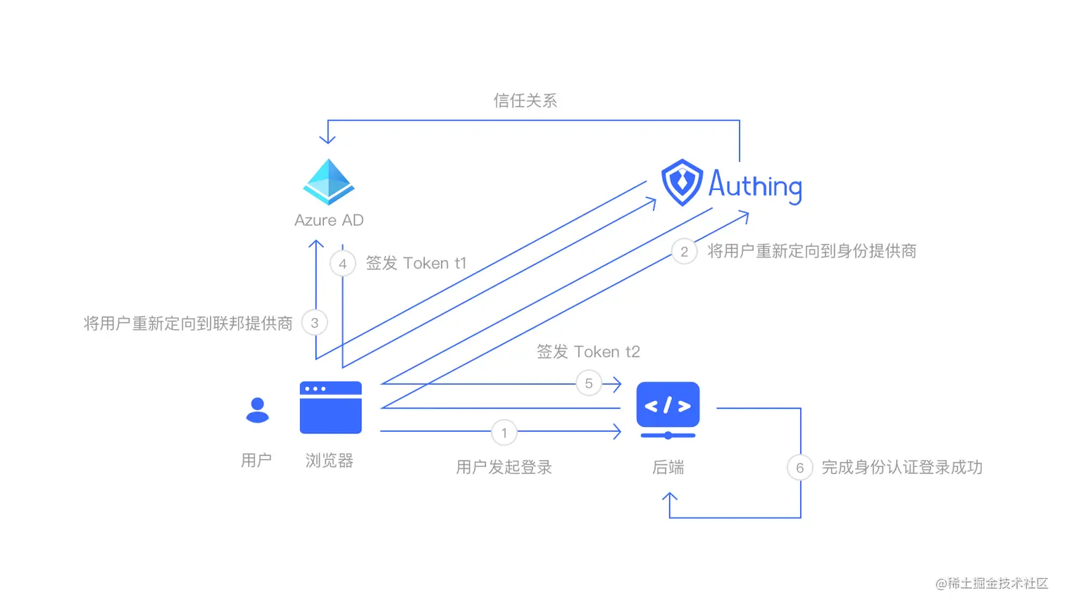 以下是联邦认证的过程,用户被重定向到身份联邦进行认证,用户先在身份联邦认证,身份联邦认证向 Authing 发送身份断言,等价于用户在 Authing 完成认证,Authing 再向业务系统发送身份断言,业务系统完成登录。