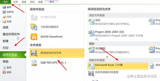 把 Project 的任务清单导出为 excel 是常用功能。 (1)另存为 excel 点击文件 → 保存并发送 → 将项目另存为文件 → Microsoft Excel 工作簿