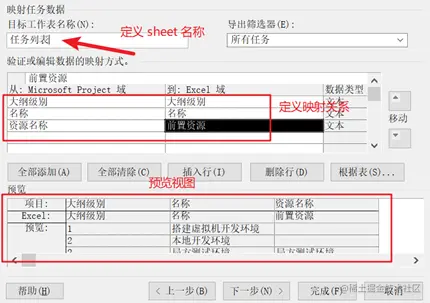 这里可以定义 sheet 名称、定义映射关系以及定义后的预览视图: