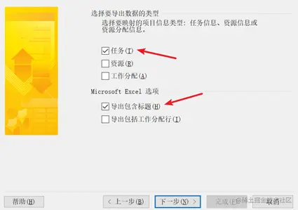 这里选择“任务”与“导出包含标题”(默认选择):