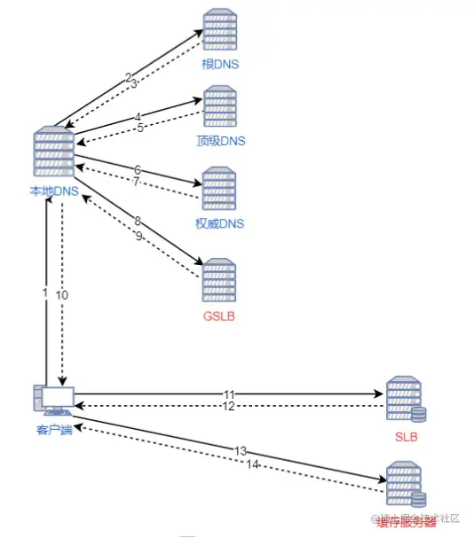 - 本地 DNS 依次向根服务器、顶级域名服务器、权限服务器发出请求,得到全局负载均衡系统(GSLB)的 IP 地址。