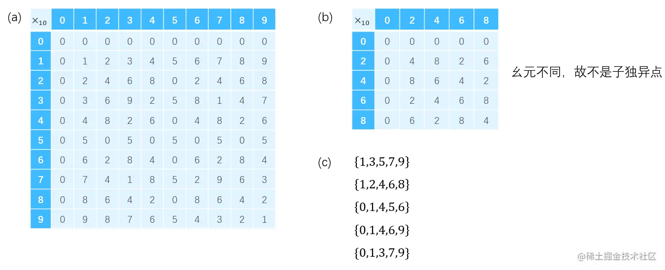 例题:设 N10={0,1,2,...,9} , ×10 为模10乘,则 <N10,×10> 是一个独异点,问题如下: