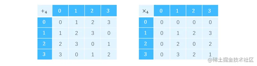 例:设 A={0,1,2,3}(也可记作N4,Nk表示0∼(k−1)个元素), +4、×4 分别是模4加、模4乘,运算表如下面的表格所示。