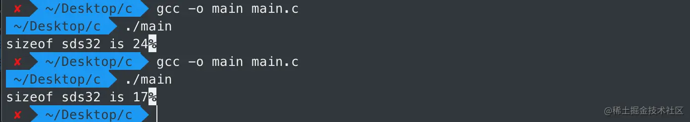 以上代码模拟SDS32抽象类型,long类型占8字节(我这里是Mac OS,类unix系统long占8字节,如果是windows,long占四字节,这里会四字节对齐),char占1字节。下面看不加packet和加packet关键字的执行结果。可以看到没有加packed,总共占了24位。有packed修饰占了17字节