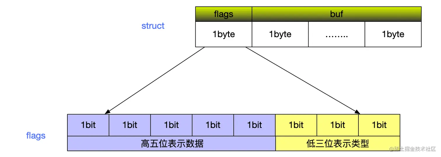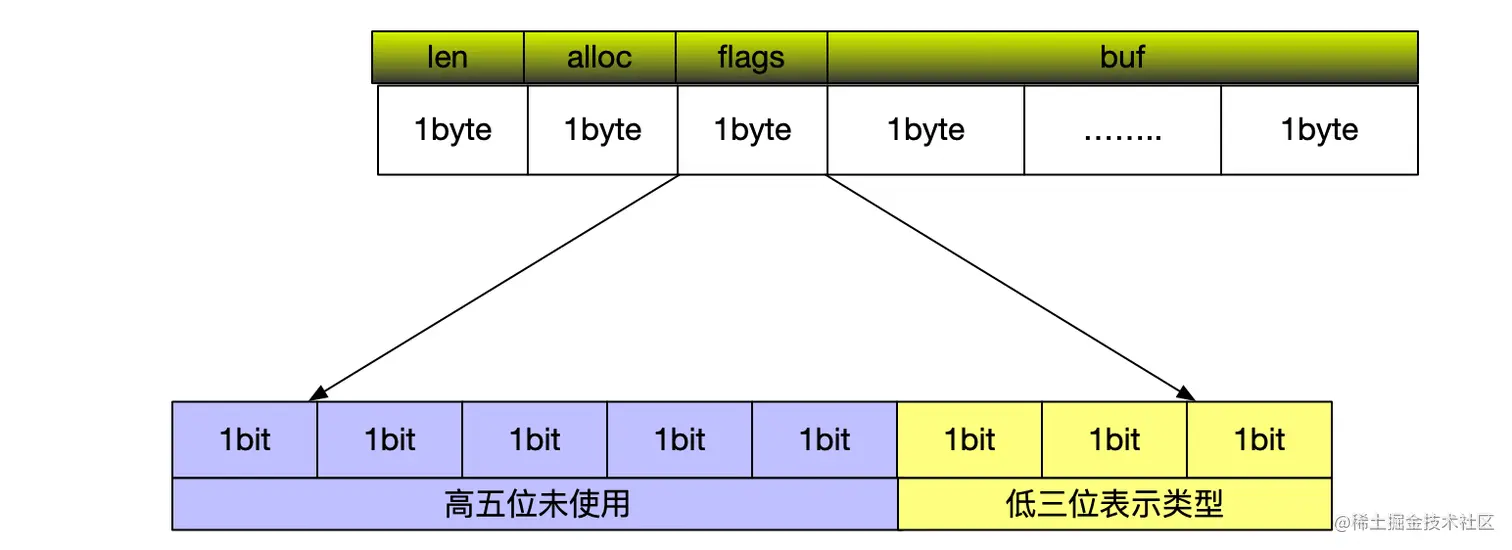 答案是flags,它是用来区分不同的数据类型的,flags位char类型占1字节,但是一共有五种数据类型,因此三位能表示8种足够了,所以就用低三位来表示类型。在第一种数据结构中,flags的高五位也用来表示字符串长度