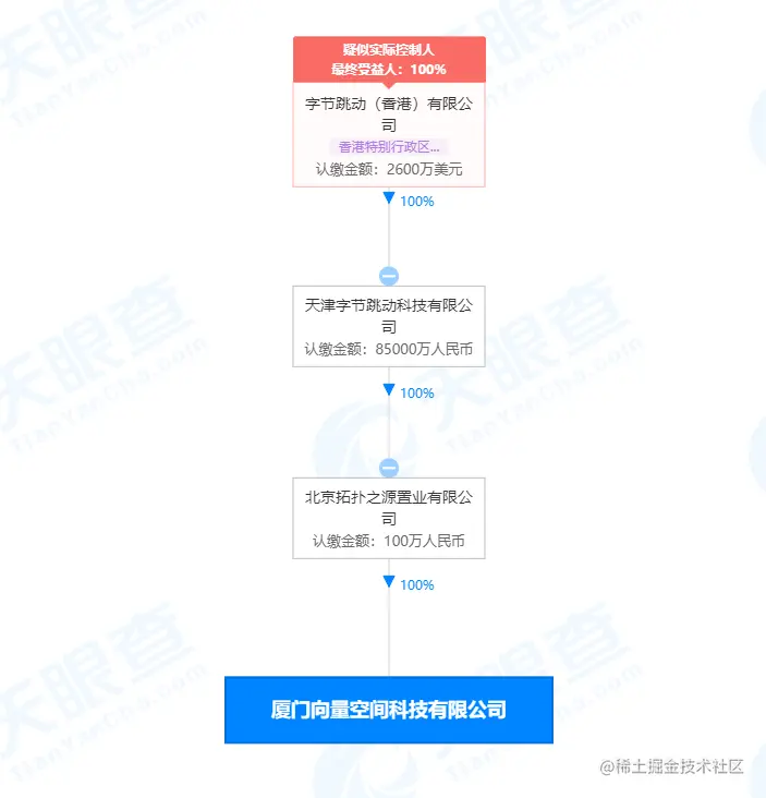 天眼查 App 显示,11 月 19 日,厦门向量空间科技有限公司成立,法定代表人为抖音短视频创始人梁汝波,注册资本 100 万人民币,经营范围含科技推广和应用服务、数据处理和存储支持服务、数字文化创意软件开发、信息系统集成服务、广告制作、软件开发等。天眼查 App 股东信息显示,该公司由北京拓扑之源置业有限公司全资持股,后者由天津字节跳动科技有限公司全资控股。