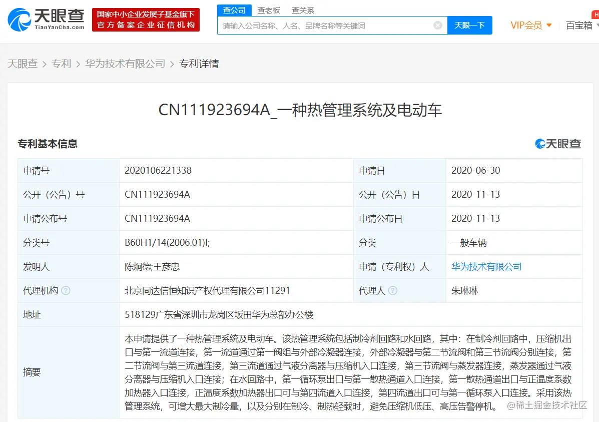 天眼查 App 显示,近日,华为技术有限公司新增多条专利信息,其中包括“一种热管理系统及电动车”及“一种车辆控制方法及相关设备”,申请公布日均为 2020 年 11 月 13 日。