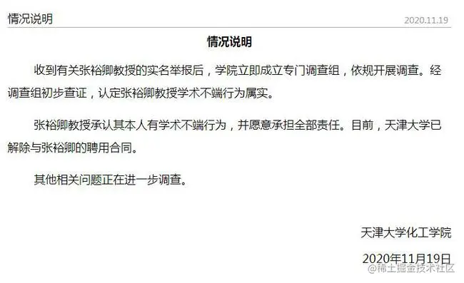 11 月 19 日,天津大学化工学院在其官网发布的“情况说明”,学院收到有关张裕卿教授的实名举报后,立即成立专门调查组,依规开展调查。