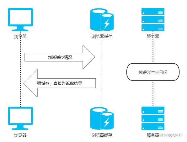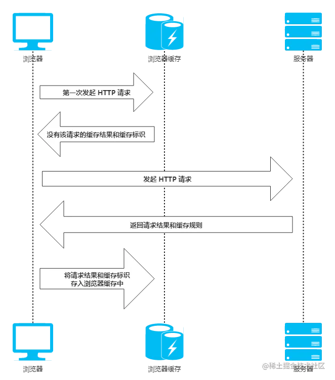 - 浏览器 读取并将请求结果和缓存标识存入 浏览器缓存 中