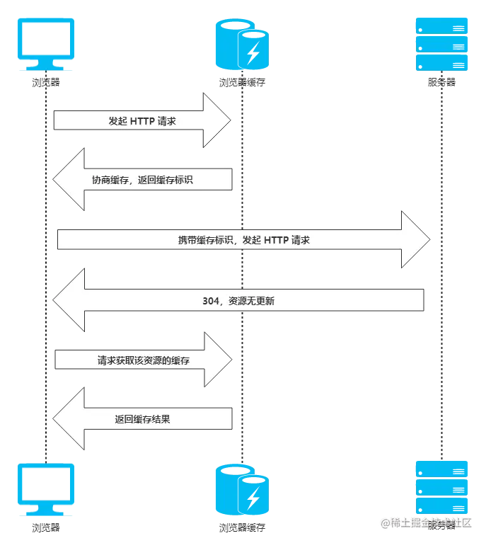 协商缓存就是强制缓存失效后,浏览器携带缓存标识向服务器发起请求,由服务器根据缓存标识决定是否使用缓存的过程。
