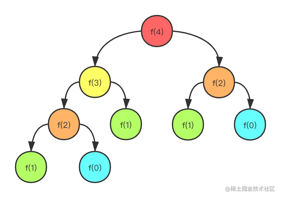 通常情况下,递归是一种直观有效的实现算法的方法,但是如果使用不当是会带来性能问题的,比方说重复计算。我们还是通过斐波那契数来举例,如下