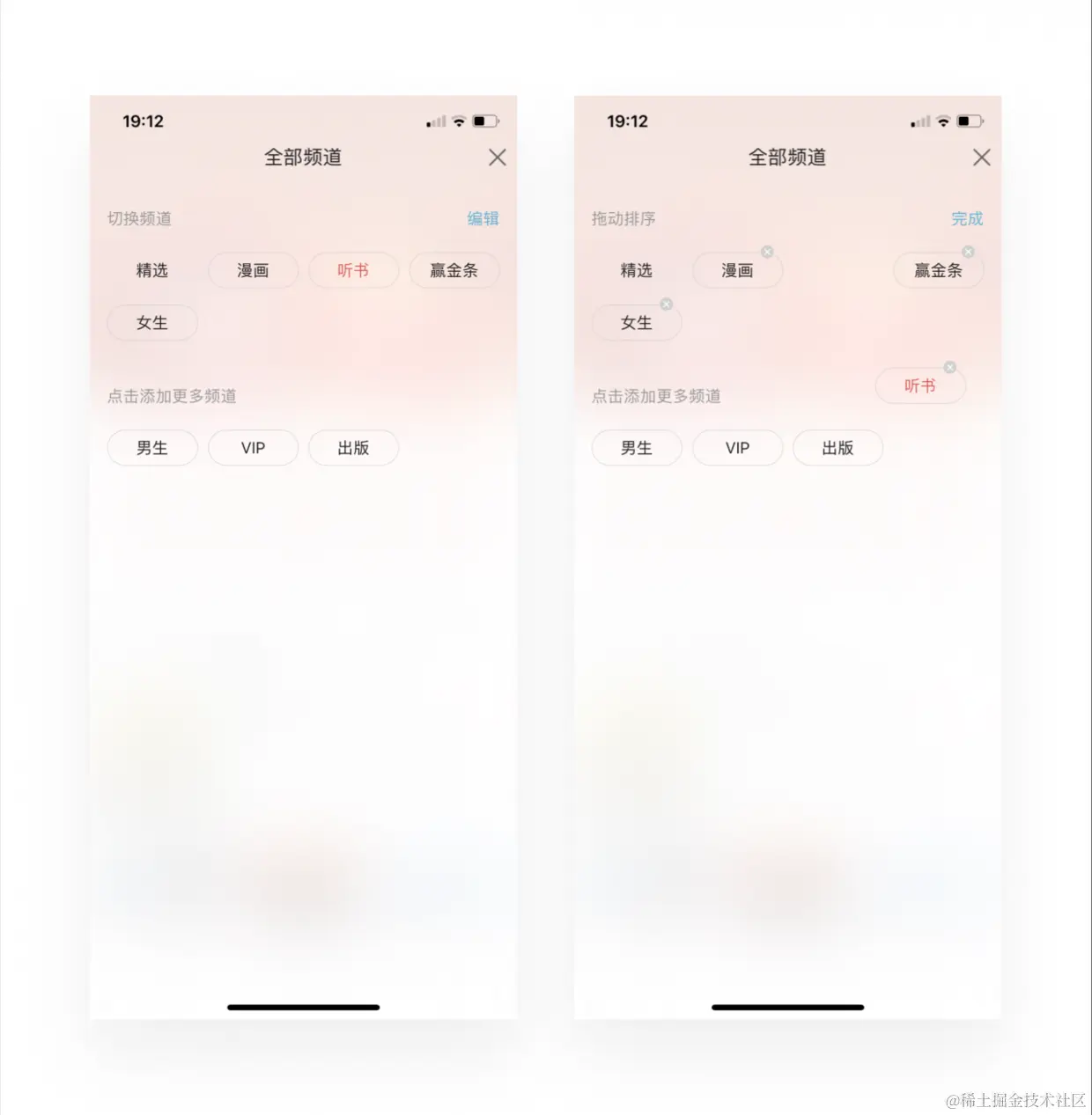 自定义频道很多人都不陌生,不过这里想分享的是关于拖动这一操作的感想。手机上拖动的操作其实并不常见,所以用户对拖动的有一定学习成本。这里解决方式是通过结合点击和拖动两种交互手势,可以达到一样的操作效果。用户点击上方标签即可将标签移动下面表示停止使用,重新点击下方标签则启用回到上方。当然也能上下拖动(箭头所指是正在拖动的状态)。这里拖动主要作用并非启用和停用,而是对品牌进行排序,根据用户习惯选择最适合自己的方式展示,将主动权交给用户。