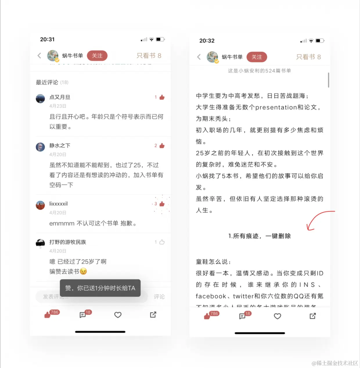 贯彻蜗牛读书的一个重要设定,就是阅读时长,每天一小时额度,可以通过别人的点赞获得时长,也能直接付费购买。这里把普遍的点赞功能和具有实际价值的阅读时长挂钩,优点是激励用户进行高质量分享获得更多的点赞,从而转换成时长;缺点是点赞成本提高导致用户不会轻易点赞。通过设计控制了点赞的热度,或许这种追求高质量的信息曝光更迎合读书产品的人群青睐吧。时长也可以是一种社交货币~