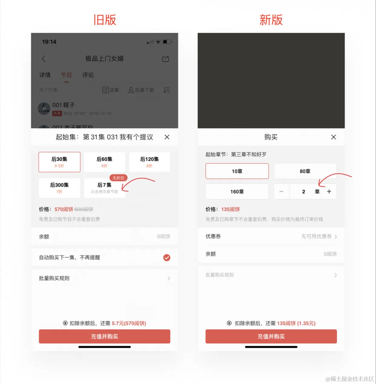向他人阐述一个陌生的实物或者概念,可以用熟悉的实物解释新事物,从而快速同步大家的认知。比如向没看过《指环王》的憨憨推荐这部电影,就可以说是国外的《西游记》。对方即使没看过,也能迅速知道电影大概故事情节。这里对比一下网文购买流程中的「选章节」这一功能的UI设计。改版前的自定义章节按钮与固定集数样式十分类似,用户初次使用并不能很好的意识到区别。反观改版后(右图),除了在外观上与固定集数样式按钮作出区分,还选用了用户熟悉的常用电商平台的数量选择器,让选章节这一功能得以快速被识别,符合用户认知。