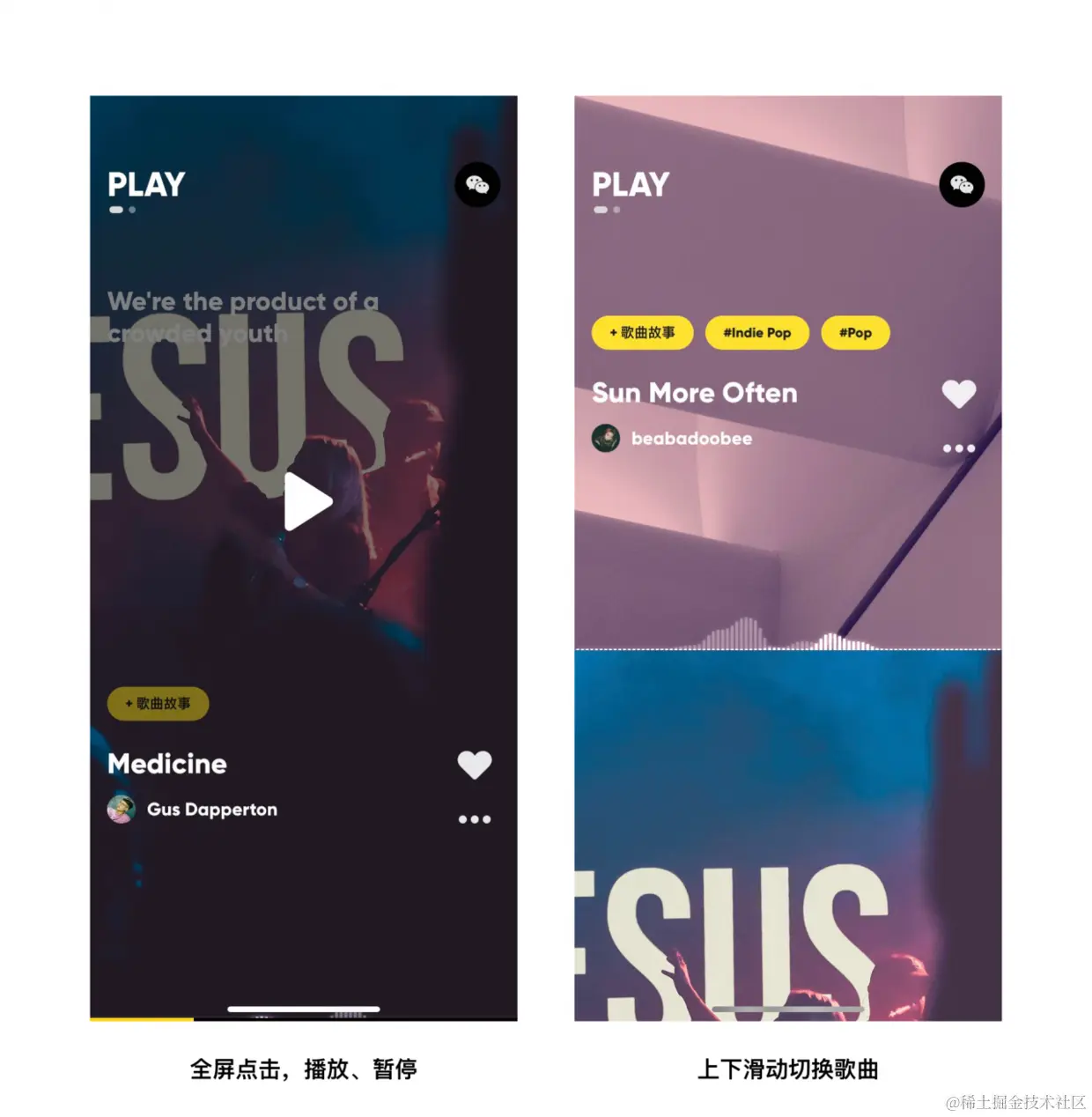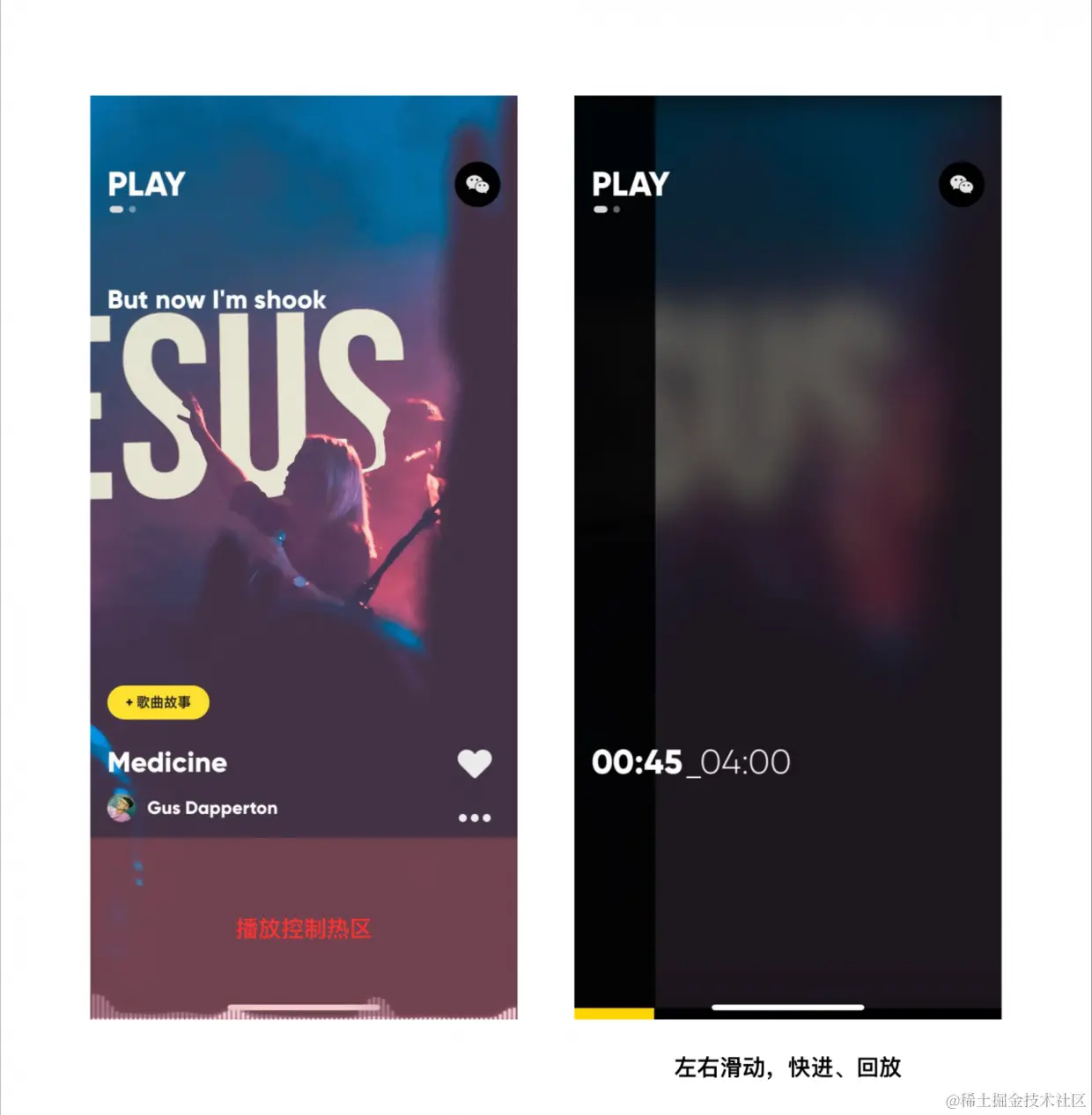 如果想发掘一些有创意的交互甚至视觉设计,体验音乐型产品可能是不错的选择。MOO音乐播放界面信息十分简洁,基本可以分为上下两块,上方可以左右滑动切换播放界面和首页,点击歌词展开全部歌词;下方是播放控制区域,可以理解成是一个看似空白的播放器控件。在热区里(图中红色区域)左右滑动即可快进,回放(变成图1右侧样式),需要播放和暂停则点击整屏幕中空白位置即刻,上下滑动切换歌曲。相较于传统的播放器控件,这样的优势在于播放、暂停的点击区域从常见的圆形按钮变为伪全屏,快进、回放也从进度条上的小圆点变成下方一整片区域。用户从精确的控制手指位置变成只需大概甚至全屏操作,无论从效率提高还是心理压力减少都是很大的优化。