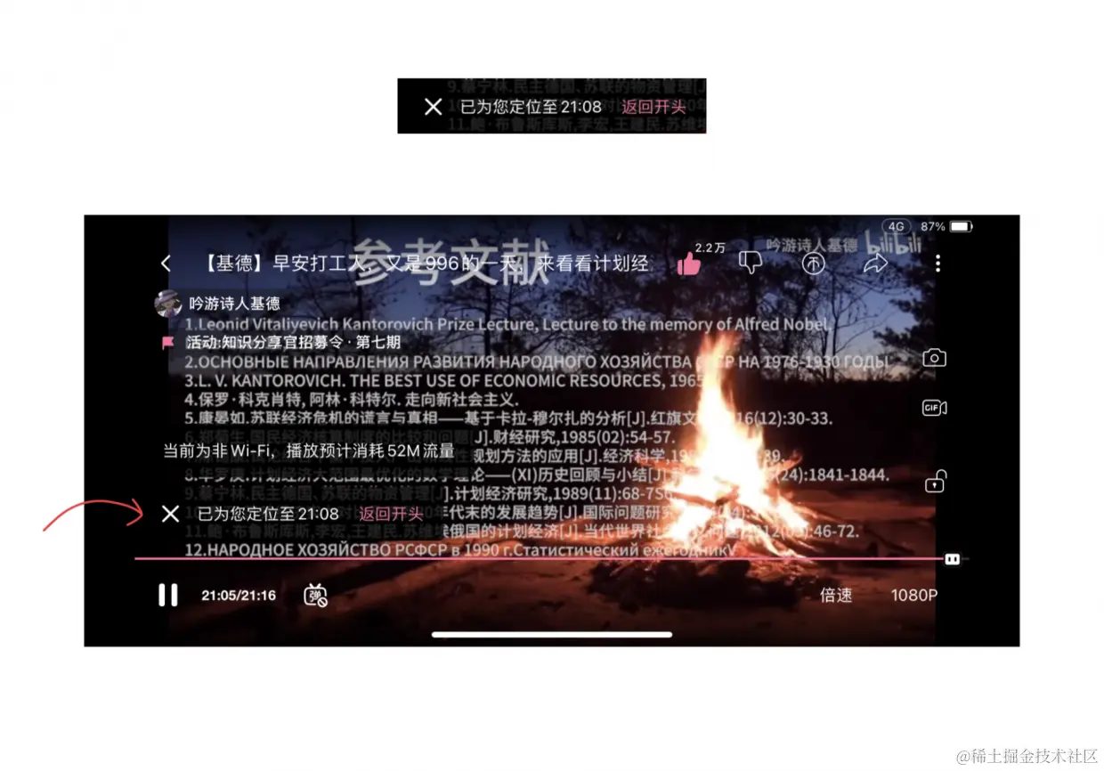 同一个产品或功能,用户需求很可能会随着使用场景改变发生改变。在哔哩哔哩中,当用户通过历史或者其他入口,打开了一个曾经看过的视频,系统判断视频时间接近尾声,会预判用户此时可能希望的动作是二刷视频,所以提示「返回开头」功能就变成了理所当然了,免去了用户拖动进度条的操作。