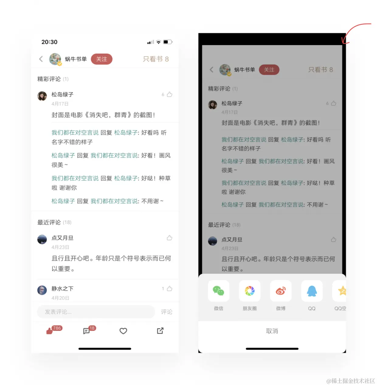 随着应用越来越强调轻量级,更多的模态和非模态弹窗运用到界面设计上,以减少页面跳转带来的界面层级过深。如果仔细留意,会发现这些看似寻常的设计里也藏着魔鬼的细节。右边的非模态弹窗并非直接在原页面盖一层半透明蒙版,而是将原来的界面等比缩小了,可以看到四周的黑色边框。搭配动效服用效果更佳,会更直观的表达了层级关系,当然不仅蜗牛读书使用到,可以留意一下身边的APP体验一哈噢~
