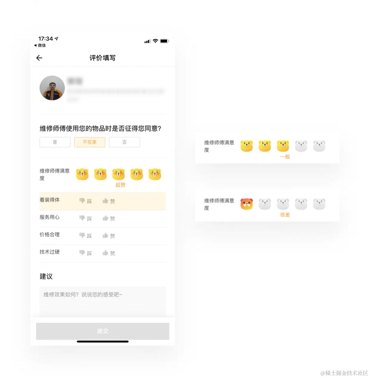 自如维修服务的售后评价,除了将小熊的品牌融入到满意度评分,还设计了不同满意度下的表情延展,每个分数都对应不同的表情。赋予了温度感,表情的信息传达也较数字直观,十分好玩。