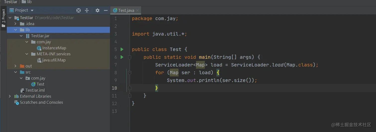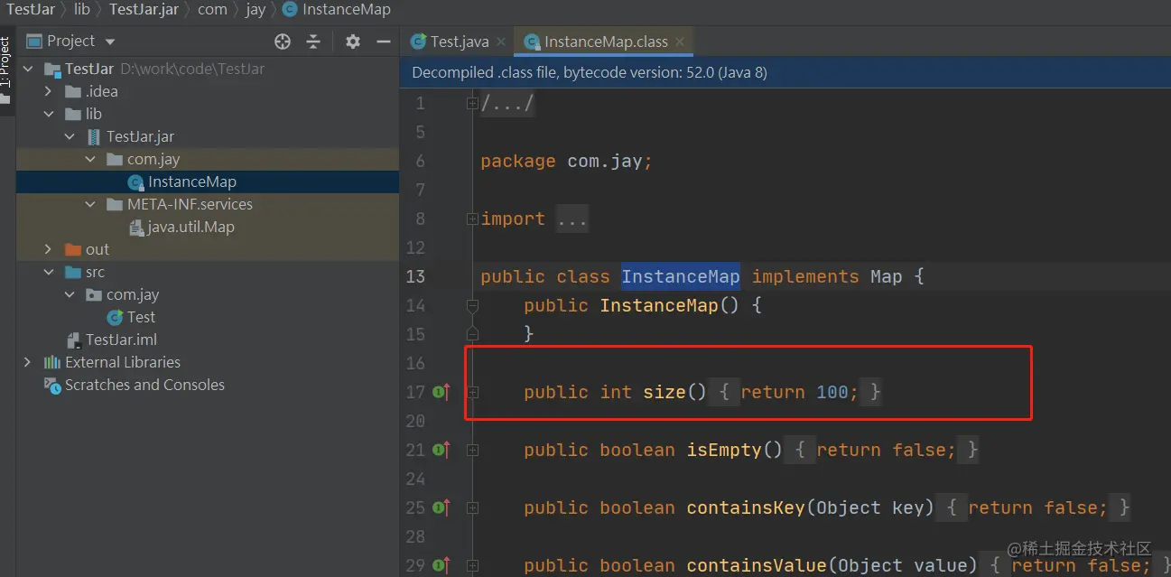 run一下打印100。这是哪里来的呢,关注到引入的TestJar.jar,类InstanceMap实现了size方法,return 100;