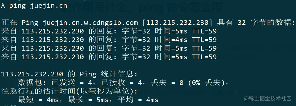 在一定的时间内,如果本机收到了应答包,则说明它与juejin.cn之间网络可达,如果没有收到,则说明网络不可达。