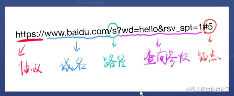 Protocol+Domain Name+Port+Path to the file+Parameters+Anchor 即: 协议+域名+端口+路径(网络服务器上资源的路径)+查询字符串(提供给网络服务器的额外参数)+锚点(资源本身的另一部分的锚点)