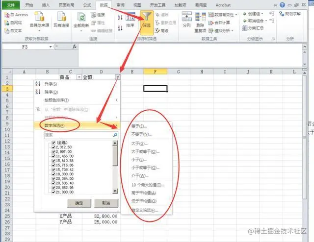 这时,筛选后,我们可以利用“数字筛选”按钮,单击后,会出现一新的选项列表,列出了各种针对数字操作的条件,如:大于/小于,或者大于或等于....