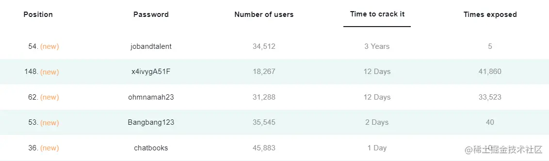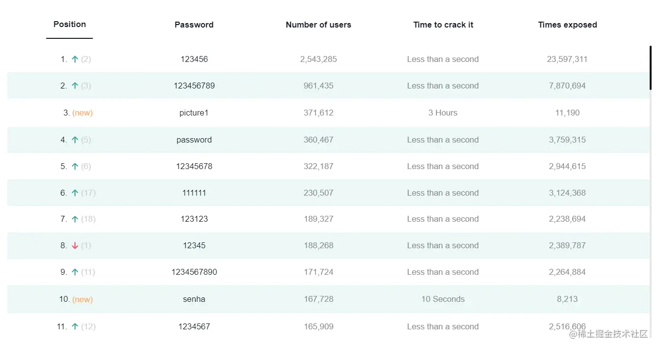 “123456”位居第一,有 250 万人使用,其在数据泄露方面的暴露次数超过 2300 万次。