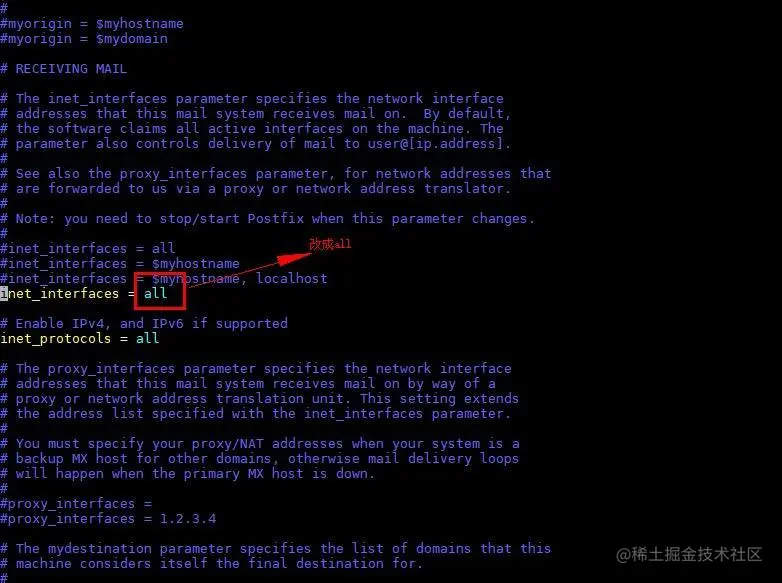 将/etc/postfix/main.cf文件中inet_interfaces值改为all