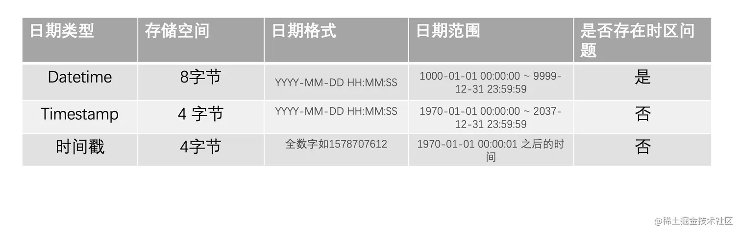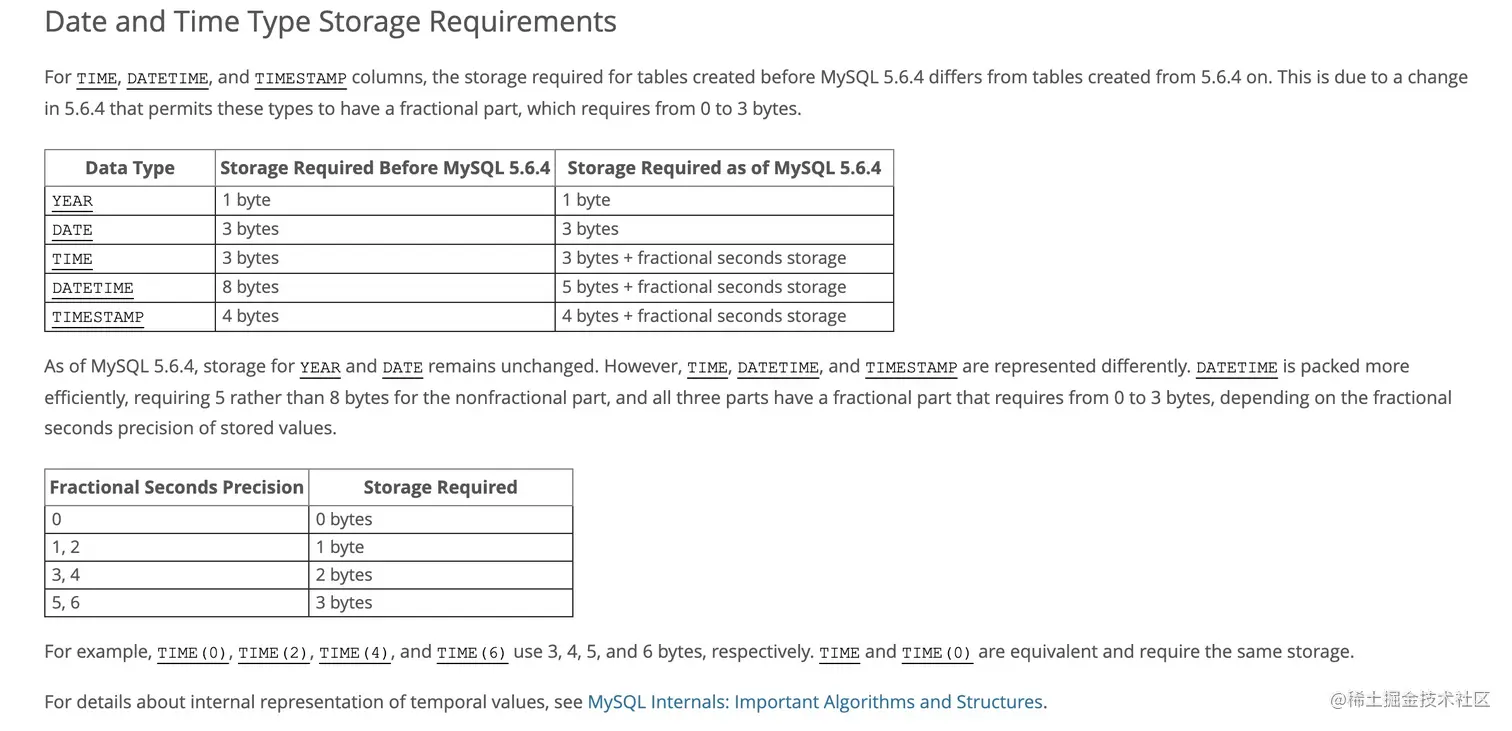 为了方便,本文我们还是默认 Timestamp 只需要使用 4 个字节的存储空间,但是 DateTime 需要耗费 8 个字节的存储空间。