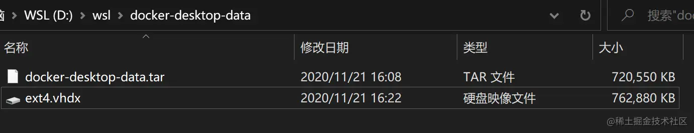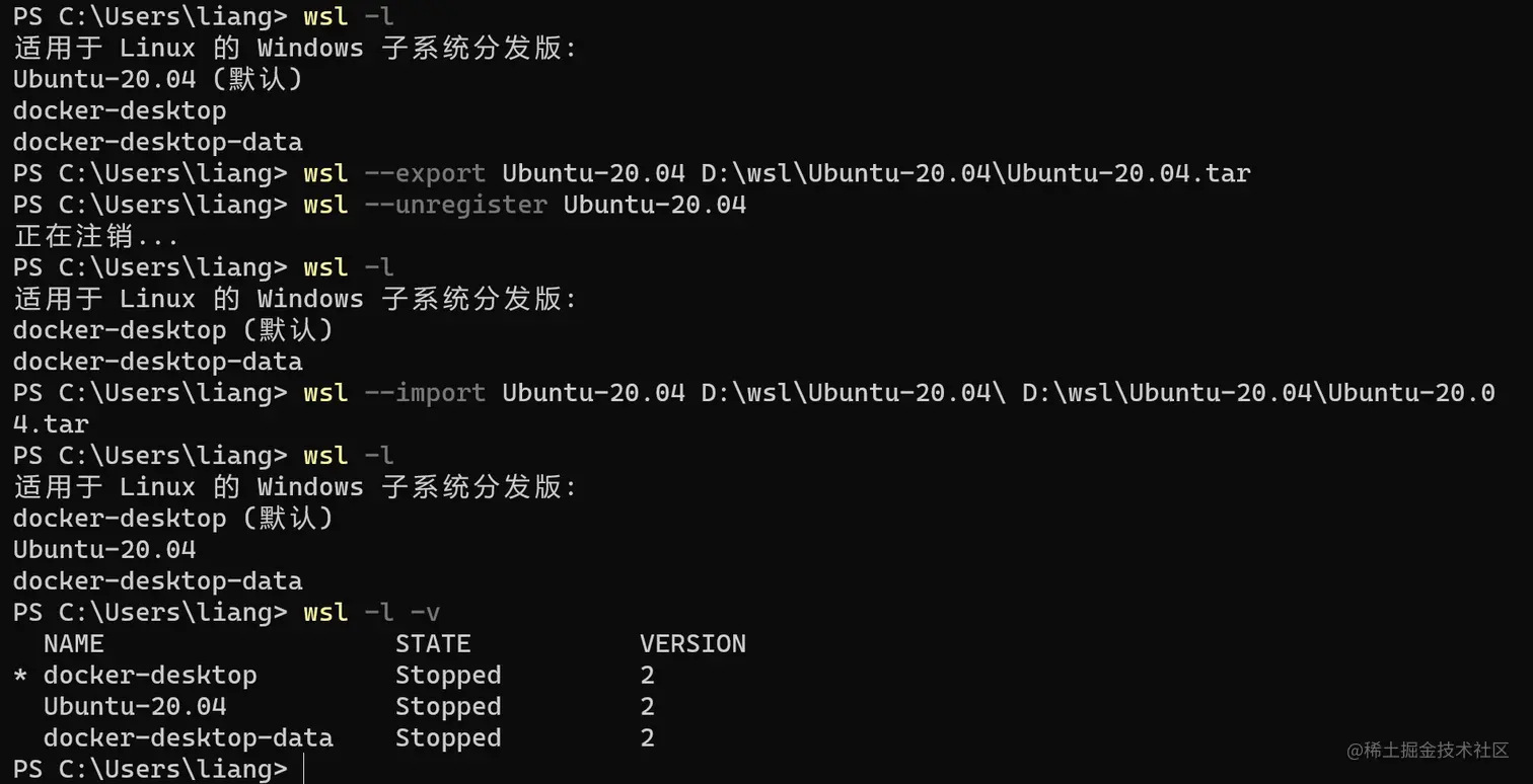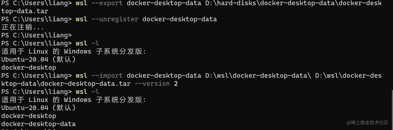 wsl --export docker-desktop-data D:\wsl\docker-desktop-data\docker-desktop-data.tarD:\wsl\docker-desktop-data\docker-desktop-data.tar导出至的目录,文件目录不能有空格