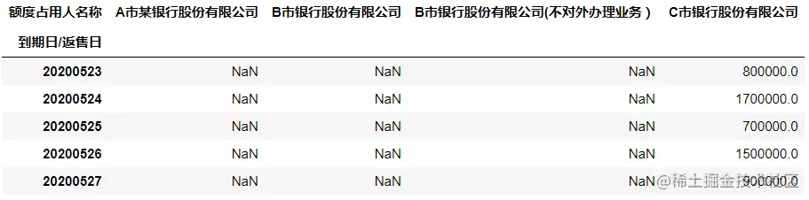 df_pivot = pd.pivot_table(df,index='到期日/返售日', columns='额度占用人名称', values='票面金额',aggfunc=np.sum)