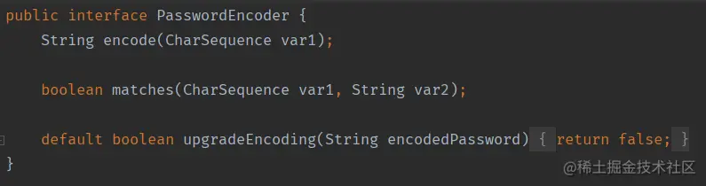 default boolean upgradeEncoding(String encodedPassword) { return false; }表示如果解析的密码能够再次进行解析且达到更安全的结果则返回 true,否则返回 false。默认返回 false。 -