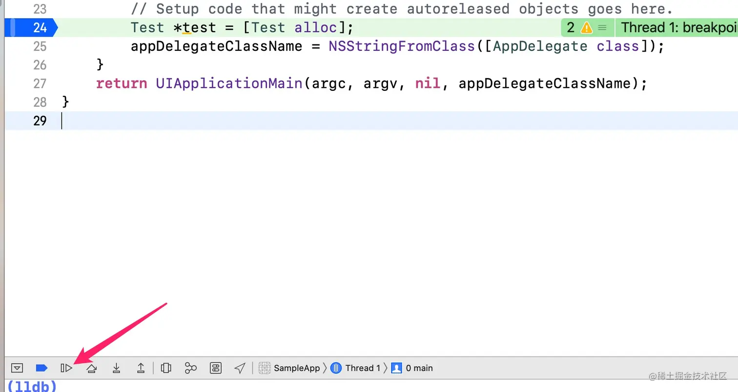也可以看到objc_alloc,然后在符号断点打一个断点,和探索方式2类似。 也可以找到我们想要看到的东西。