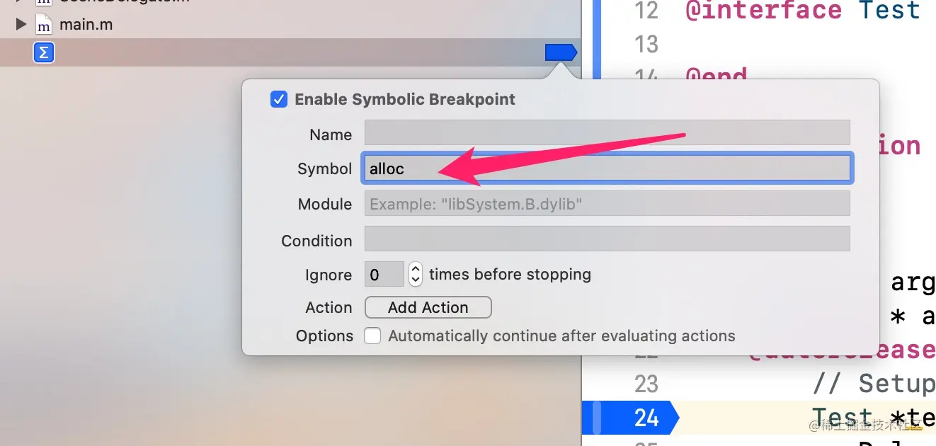 创建一个alloc的符号断点。