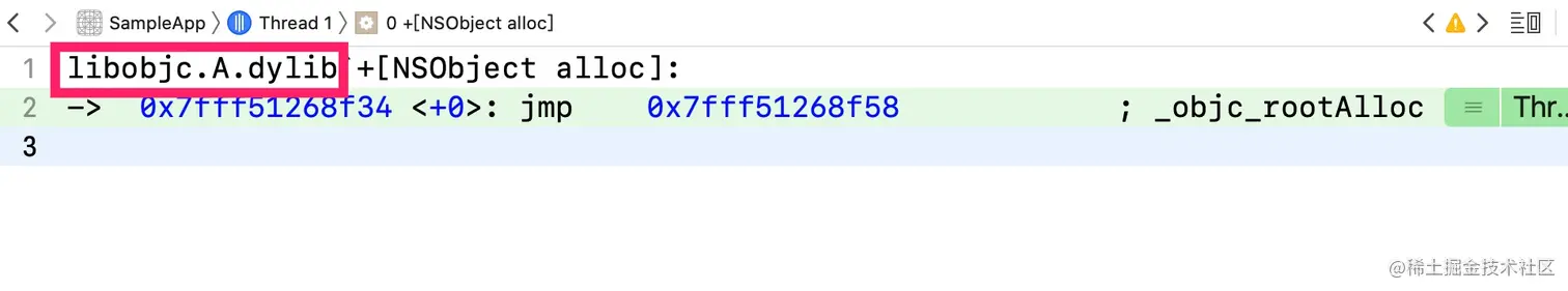 然后就看到objc_alloc,然后去打一个objc_alloc的符号断点,就可以看到当前所在的库是libobjc.A.dylib。