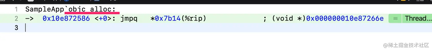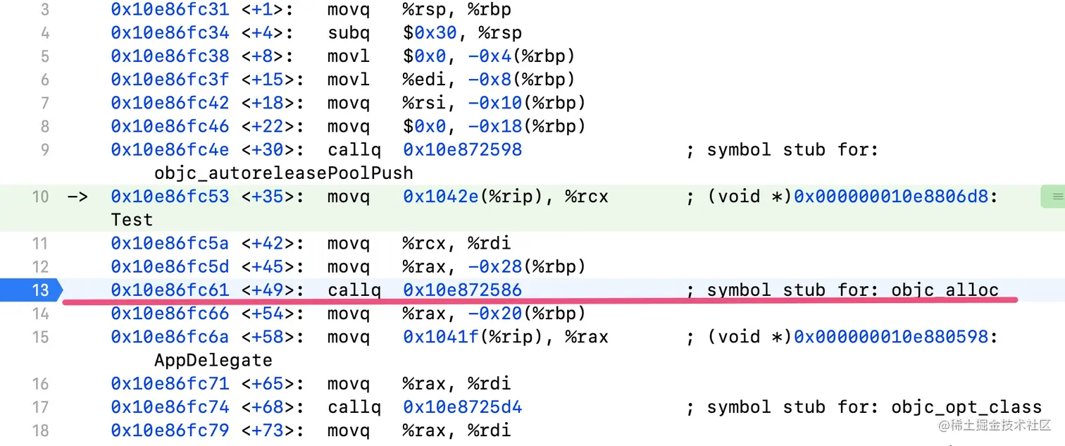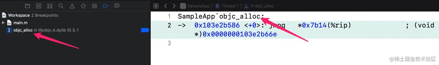 进到汇编里来,在objc_alloc这里打个断点,继续运行到这个断点,按Control键进到里面来