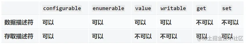 即数据描述符可使用的键值有configurable、enumerable、value、writable,而存取描述符可使用的键值有configurable、enumerable、get、set。