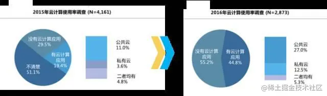 随着云计算市场的成熟,用户对于私有云的接受度大幅提升。在接受调查的2873家企业中,已经应用云计算的企业有1286家,占44.8%,较2015年调查结果(19.4%)大幅提升。同时,私有云部署与应用提速,私有云部署占云计算应用比例增长8.9%。