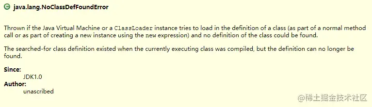 当JVM或类加载器去加载一个类定义(无论是通过普通的方法调用,还是用new语句去创建该类的实例所触发的类加载),如果该类的定义丢失,那么就会抛出NoClassDefFoundError. 被加载的类定义在当前执行类编译时是存在的,但是再也找不到了