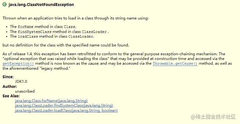 当应用使用类的字符串名,通过以下方式尝试去加载类,但是根据指定的名称无法找到类定义时会抛出ClassNotFoundException: