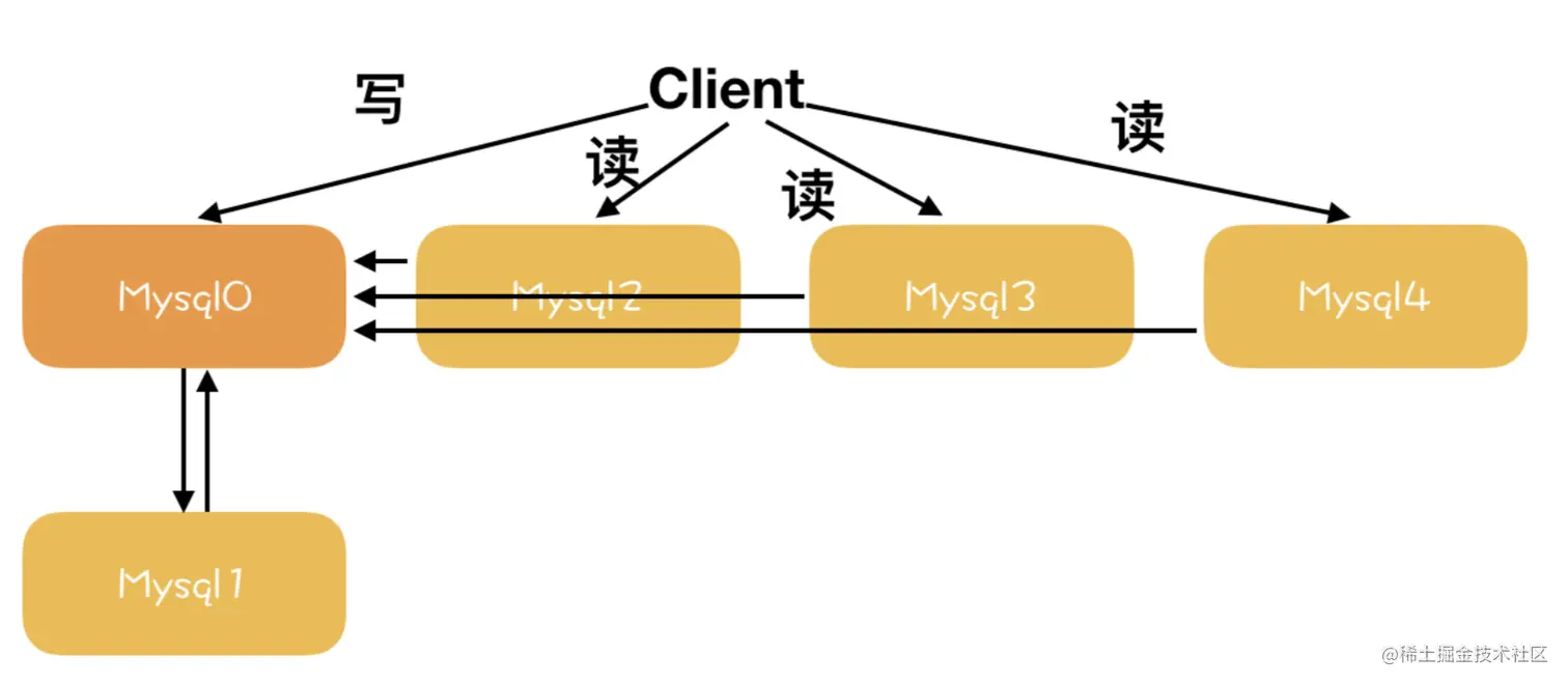 读写分离场景:mysql中如果只部署一台机器在大数据量的情况下会容易出现性能瓶颈,因此会考虑部署主从拓扑结构,一般的做法是写操作在主server上,读操作在从server上,以此来减轻主server的压力,提高读写性能,支持更多的读写请求。